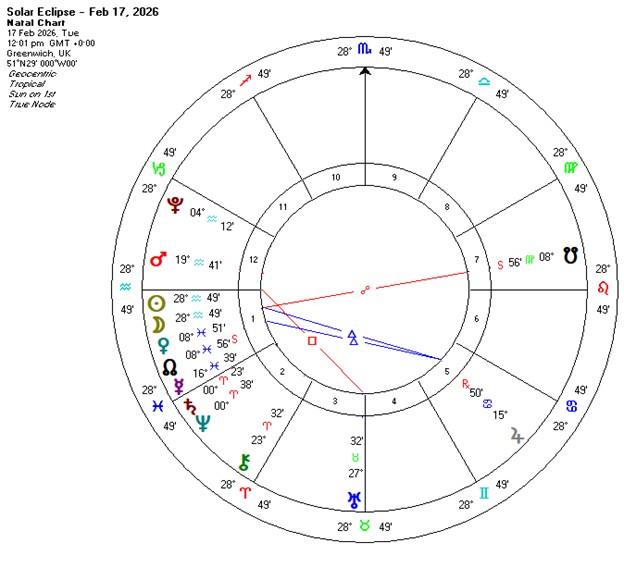 Aquarius and Pisces, the 11th and 12th Signs, are strong in this Solar Eclipse chart – indicating that its impact is destined to be worldwide and will trigger the collective mind.